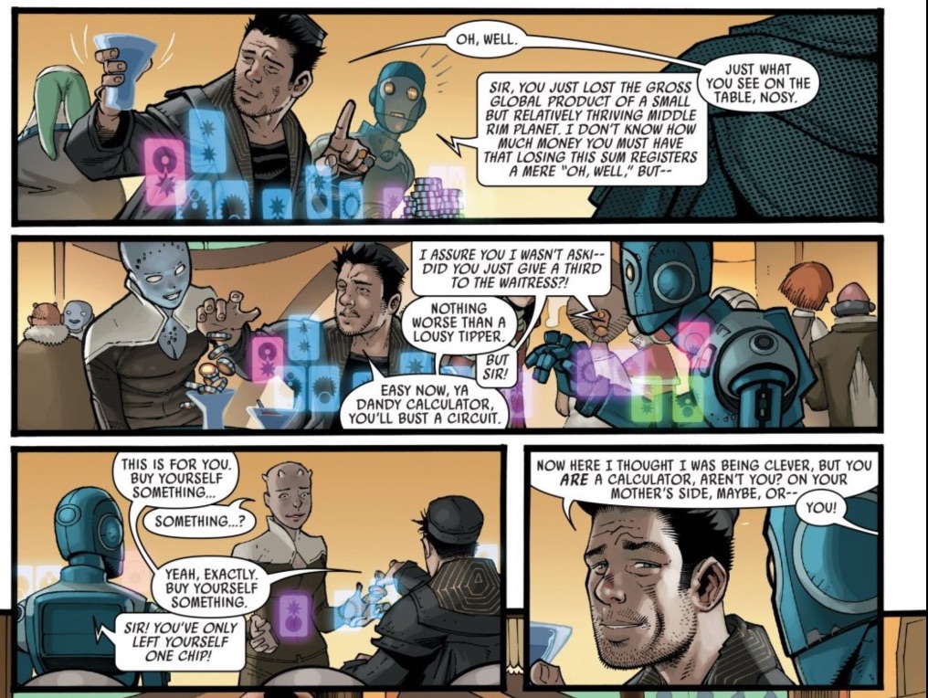 The character trope of the loner only out for himself has been done before in Star Wars, and done well. Dr. Aphra great example of how to pull this off. Even though Aphra herself is ostensibly only out for herself, she’s an interesting character because of her self-loathing and shifting moral compass. In short, while she’s definitely out for herself most of the time, there’s something more to her motivations than simply winning money and that makes her comic much more interesting to read than this issue.
