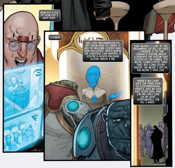The most engaging element in the casino sequence is the Blackjack-style holo-card game that opens the issue. It’s a fun visual and walks the line between a game we all understand and something perfect for a space opera.