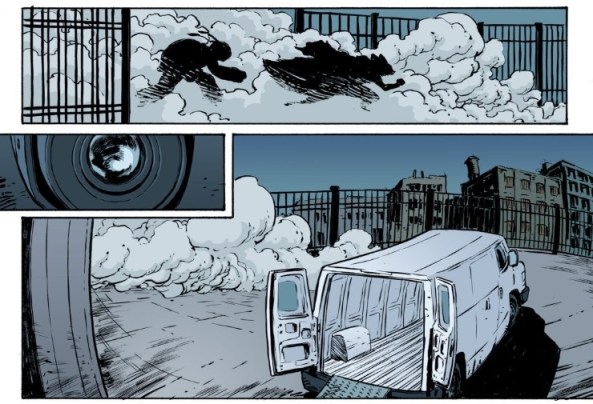 The action isn’t all that dynamic, but what makes these panels so good is the way artist David Wachter organizes these panels. First, he uses an establishing shot of Raph and Alopex sneaking into the courtyard under the cover of smoke. He then uses a small insert shot to show that this courtyard is being monitered by security cameras. He then cuts back to the courtyard only this time we see it from the point of view of the camera with our heroes fully camouflaged by their artificial fog. This sequence does a great job of creating tension by using that cut to the camera and makes Alopex’s advice that she and Raph actually act like ninja seem all the smarter.