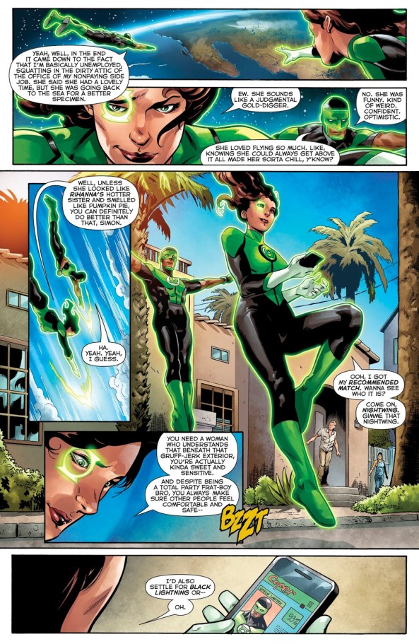Mark: Green Lanterns 40 is Tim Seeley at his best, and so much of my enjoyment of the issue comes down to the relatability of each and every hero. The Bulleteer is a superhero, yes, but she’s also just a woman worried about the well-being of her friend. Baz is a protector of the universe, sure, but he’s also mildly terrified when he recounts his date with Night Pilot and the stress of simply having to wait for internet to be installed in a new apartment.