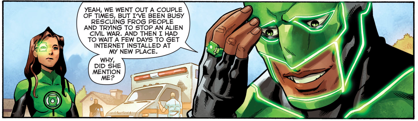 Mark: Green Lanterns 40 is Tim Seeley at his best, and so much of my enjoyment of the issue comes down to the relatability of each and every hero. The Bulleteer is a superhero, yes, but she’s also just a woman worried about the well-being of her friend. Baz is a protector of the universe, sure, but he’s also mildly terrified when he recounts his date with Night Pilot and the stress of simply having to wait for internet to be installed in a new apartment.