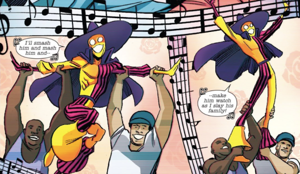 The issue opens with Madcap returning in grand fashion: a song and dance routine. Scott Koblish draws the scene as if we are watching the performance broadcasted behind the blurry lines of someone’s TV screen. It’s a wacky way for Koblish and Gerry Duggan to reintroduce the indestructible maniac, but one thing I found interesting/distracting was the song itself.