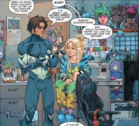 And part of that is because the scripting team of Dan DiDio and Justin Jordan have done such a great job of anchoring this kid in the reality of a teenager in 2018. Or, at least, this is where I have to project my mid-thirties perspective onto the mind of a modern teenager, but everything feels pretty close to correct. If nothing else, Derek and Ernie live lives that are immediately recognizable as 2018 lives, without any of the yearing-for-a-time-before-cellphones shit that seems like comfortable ground for most creators. There’s a moment when Derek drops in on Ernie unannounced — y’know, like Batman or any other hero would — and she tells him if he ever stops by without a text first, she’ll kill him. You ever try to surprise-facetime someone? You’ll get the same response.