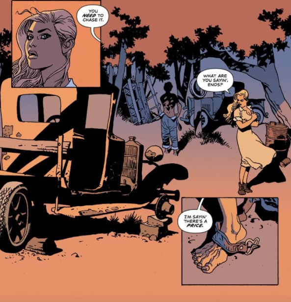 Maybe I’m taking “you see your blood leave your body” too literally, but it’s Enos’s insistence that Tempest knows what he’s talking about that convinces me that he’s at least hinting at menses. Or maybe I’m not taking that insistence literally enough. Leave it to Azzarello to hit his double meanings subtly enough that I’m never sure if I’m missing things or adding them myself. Still, its hard for me to not be reminded of that particular reading during this conversation.