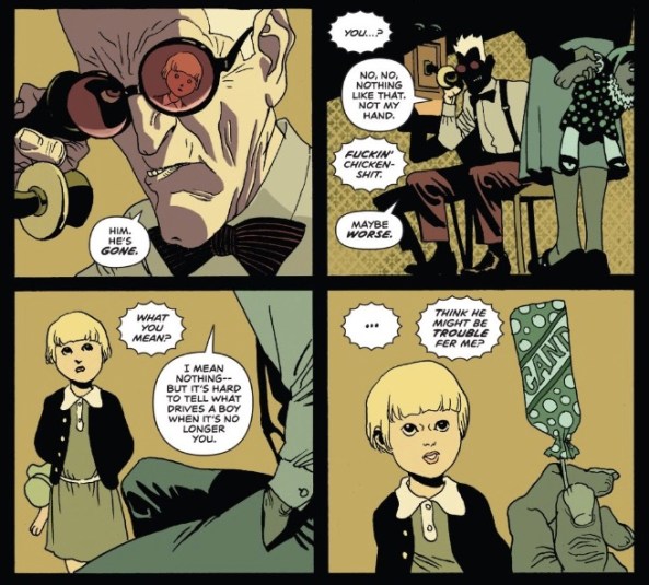 It’s interesting that this issue — one of the least violent, that fight at the rail yard notwithstanding — should be the one to prompt this discussion, but it’s actually one of the more emotionally brutal chapters in this story so far. Lou’s story of abuse is hard to read, and I can’t help but feel for Enos as he laments the burden of being the family’s designated monster. And actually, that rail yard beatdown only emphasizes the brutal nature of this issue — the only person made to truly suffer the consequence of violence in this issue was only trying to break the cycle of violence, hoping to rescue Lou from his own demons.