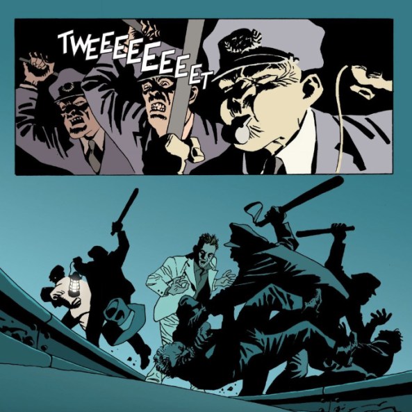 Risso and colorist Christian Rossi support this narration with an impressionistic tale of a young boy — presumably Lou Pirlo as a boy — taking shelter in a store front, only to discover a greater threat in doors. Later in the issue, Pirlo narrates his experience being beaten by his father. He even tries to make it sound like it’s a good thing: y’know like getting the shit kicked out of him gave him the strength to fight off the police. Risso has no such delusions about whether or not this brawl is cool – it ain’t. It’s dark, messy, chaotic.
