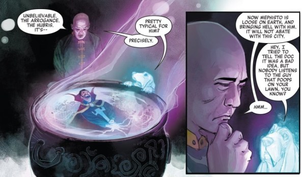 Bats the (ghost) dog is a true friend, seeking out help when Strange needs it most. Wong, on the other hand, is ready to leave Strange to handle his mistakes on his own, and truthfully, nobody could really blame him. “Las Vegas” perks his ears, though — Strange may not deserve Wong’s help, but all those other innocent souls do, and he can’t stand idly by as Mephisto threatens the world. As Strange predicted, Wong comes through when it matters most, assembling a team of Blade, Moon Knight, Elsa Moonstone, Doctor Voodoo, Man-Thing, Iron Fist, and Ghost Rider to combat Mephisto.