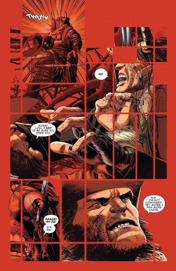 In the turn of a page the gutters flash to bright red, as if we are visualizing Loki’s nervous system to his excruciating pain. The second “panel” cleverly masks Loki’s eyes with a red gutter panel, saving the horrific reveal of that pierced eyeball for the bottom of the page.