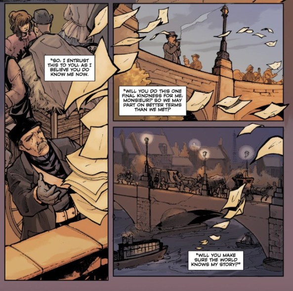 That naturally extends to her memoirs, which she hands off to Bouchardon in the hopes that he will have her pages published. Of course, he doesn’t — he’s too well acquainted her her tactics to be taken in by such an obvious ploy to drum up sympathy. Instead, he lets the pages go off the side of a bridge, scattering them to the wind. Kristiana allows these pages to drift between the panels, transgressing both the panel dividers and the unity of time in the scene. A chyron at the top of the page identifies this action as taking place “Midday” which is, incidentally, the only time one of these boxes pops up with information that doesn’t reveal a specific date in history. The time of day is what’s on the creators’ minds here. Bouchardon throws the pages to the wind and look what happens: