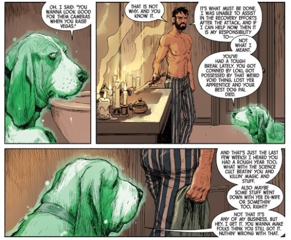Donny Cates and Niko Henrichon’s Doctor Strange 387 takes place concurrently with Damnation 1, meaning the issue opens before Strange raises Las Vegas, allowing us to see the preparation he put into the act. His prep is both magical and more mundane, including a bit of hair dye to cover up his graying temples. Bats extrapolates this minor act of vanity into an entire thesis statement, and I think the ghost dog’s got a point.