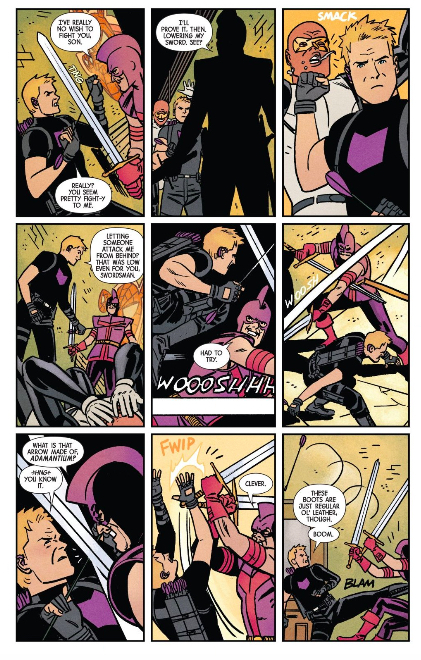 Romero’s mastery over your eyes throughout this issue is absolutely stunning. There is so much to see on every page, but he somehow guides the reader through the noise in an orderly fashion. Sometimes he achieves this with handy Hawkeye targets that indicate what kind of trick arrow is being used, and sometimes the targets just reveal useful information about their surroundings. In the fight between Clint and this Pinky Purple Knight guy is a particularly good example of Romero’s control.