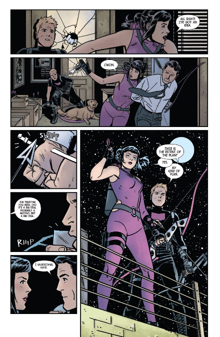 Of course, any discussion of storytelling in this issue would be remiss to neglect Thompson’s contributions. As ever, I’m enamored of her knack for patter (Patrick, I was sincerely hoping you’d give me a prompt for which “hard same” would have been an appropriate answer), which is on fire in this issue. Double the Hawkeyes means double the patter, and Thompson has fun with every damn line. They’re all great, but what the heck, here’s my favorite: