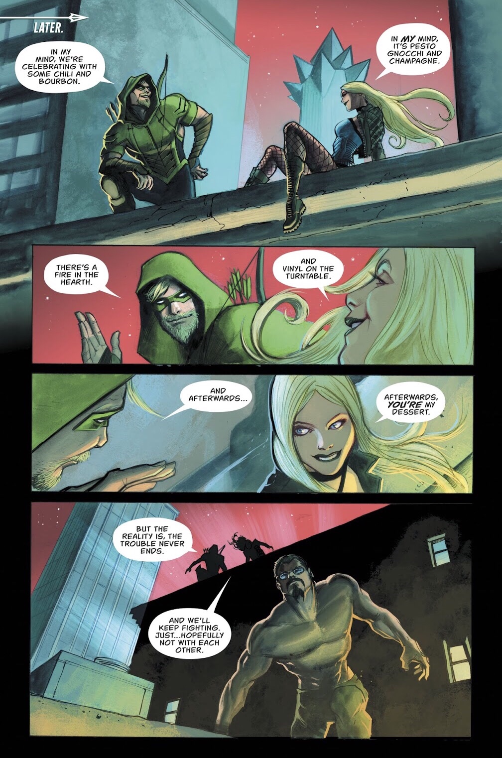The two lovebirds discuss what they’d like to be doing to celebrate Oliver’s victory in court and a the beginning of a bright future. However, they know that in this life “the trouble never ends.” Like the end of a James Bond film: “Green Arrow will return in Green Arrow 39.” It’s not the end, because it never really ends.
