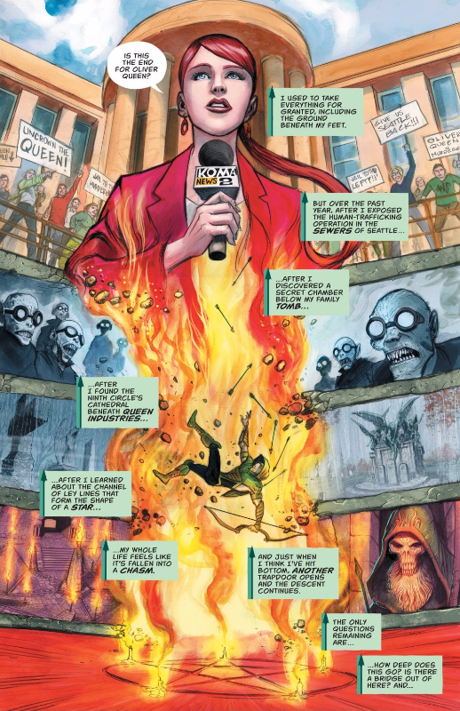 On this page, for example, I love how Ferreyra quite literally depicts the ground falling out from beneath Oliver’s feet. The underground has been a running theme in this run — it’s where the Ninth Circle’s hideouts and the Queen’s tomb have been — so Oliver falling further and further underground depicts not only his situation getting worse and worse, but him literally stumbling into greater and greater evil. I’m going to miss this kind of stunning work so much, and I hope to see Ferreyra on another title (hopefully a big one!) soon.