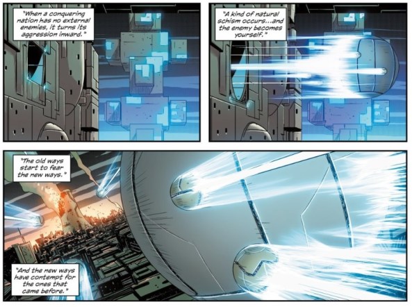 One doesn’t have to read too far into these to see that they’re an allegory for the current state of affairs in the United States. The country doesn’t have any true struggle to come up against and now finds itself a country with split and fragmented society. Just as Wolf says, there are the old who hold to an outdated version of American history in a hope to make the country great again. Those who are more forward-thinking and don’t subscribe to this philosophy, and look upon its practitioners as backwards. As with the other allegorical content in this issue, it’s clear Hickman, in this instance, is once again turning his critical lens upon the country he loosely based his comic on.