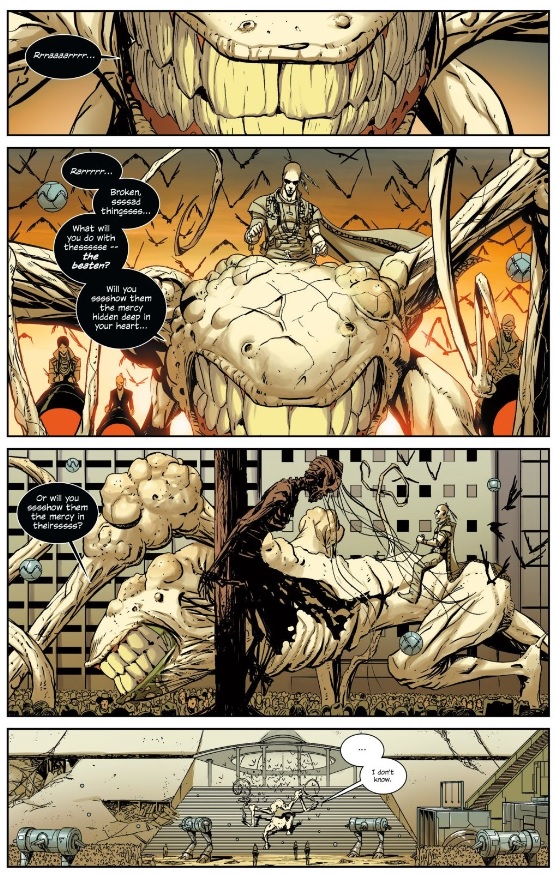 Of course, for all of Wolf’s words about the hard work of building something better, he’s not actually in the building business. Which means he abdicates his responsibilities as Chief of Chiefs just as soon as the Union is conquered. Peace was but a means to the end of returning his attention to the message, which might just be the case for East of West as a whole. Or, rather, that war was but a distraction from the message. Then again, with things boiling over between the PRA and the Confederacy — and with Death and Babylon only a couple days’ ride from the front — I don’t think we’ve seen the end of war just yet.