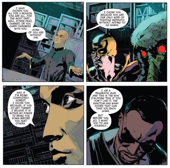 Wong is assembling a team of dark superheroes to rescue Stephen Strange from the evil clutches of Mephisto, who is enjoying a stay up on Earth thanks to Strange’s resurrection of the lost city of Las Vegas. The team that Wong enlists are all heroes who skirt the morality scale and/or are undead, the idea here being that Mephisto won’t be able to corrupt their souls since that’s happened already.