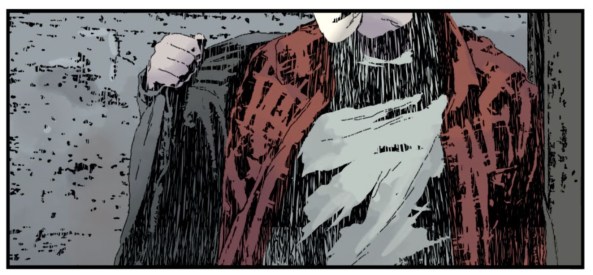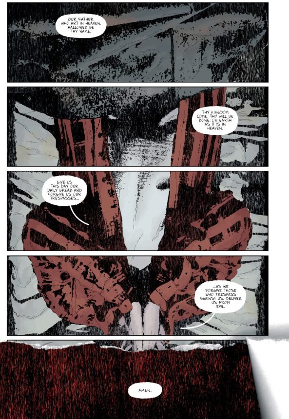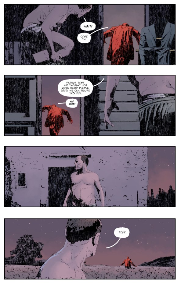 I have no idea what the production schedule of a comic like Gideon Falls is versus a monthly superhero title from DC or Marvel, but it seems evident that Lemire, Sorrentino, Stewart, and Wands are afforded some luxury of time to make considered choices. For instance, once you make it to the end of the issue and it’s apparent that red is used as a signifier of something touched by evil, going back through the issue is rewarding. You notice that Norton is dressed in a red button down shirt over a white undershirt; the red shirt isn’t the vibrant red we later see bathing Father Tom, it’s a bit more muted than that.