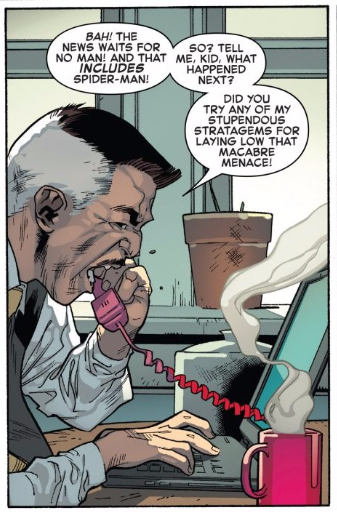 Another impressive fact about this is that, while comic books don’t have sound, they do have “voice.” The best writers can differentiate their cast by the way each character speaks alone, and Slott certainly knows how to do this. Take J. Jonah Jameson, for example.