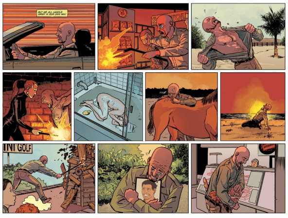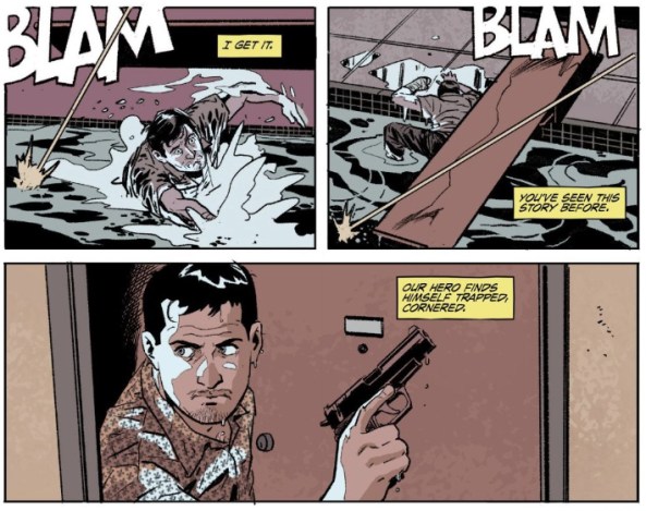 Mac is gunned down in a shitty hotel, just like the previous issue had essentially promised in its final pages. Of course, the expectation is that he, as one of our perspective “hero” characters, would have found a way out of this mess. At least, that’s what issue 10 would have you believe. Spencer shows the reader his plan from first handful of panels. These panels, by the way, are lifted directly from the previous issue.
