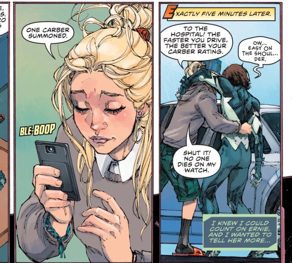 Sorry, I’m getting worked up here, and I’m not even off the second page. Here’s another early detail that irked me. Ernie calls an Uber to take Derek to the hospital. I’m going to gloss over the fact that the reader really doesn’t need an answer to the question “how did they get from Ernie’s house to the hospital?” The name that Jordan and DiDio came up with for the fake ride sharing app is “Carber.” It’s an absurd name that only works if you already have “Uber” in your head — otherwise where does that “-ber” come from?