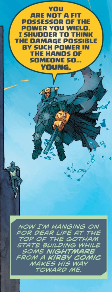 It doesn’t help that Derek has this thought while clinging to the side of the “Gotham State Building” which has got to be the laziest naming job I’ve ever read in a comic. The name doesn’t even track logically: the Empire State Building isn’t called the New York State Building (and if it was, it’d be some bureaucratic office complex in Albany). You want to name a skyscraper in Gotham? Name it for one of the affluent families or powerful companies in the city. Wayne, Kane, Powers, Cobblepot, Elliot — YOU’VE GOT TONS OF OPTIONS.