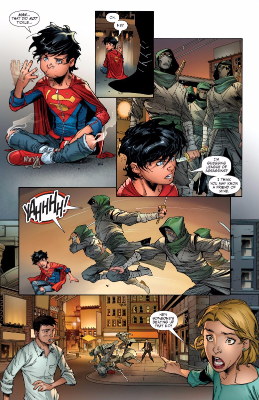 I actually wouldn’t have minded a little more pathos out of Jon, as he almost seems too calm about his mother being targeted by an assassin, but the moments where Lois and Jon do interact are golden. I feel like this mother/son bond has been a bit neglected in favor of Jon/Superman, so it’s fun to get to see them spend time together, even if they do have to hide the fact that they know each other at all. Jon’s awkward attempts to hide his identity (and hide his mission from Lois) are adorable, but I love how Lois immediately knows that Jon’s hiding something from her and lets him know this in no uncertain terms. Yet, while Jon seems to think he’s grounded, I get the impression that Lois trusts that he’s doing the right thing and just wants him to know that he can’t hide anything from her. It’s a smart use of Lois as a character, a nice contrast to Damian and Talia’s far more screwed up dynamic, and a nice opportunity for Jon to stand on his own without Damian.