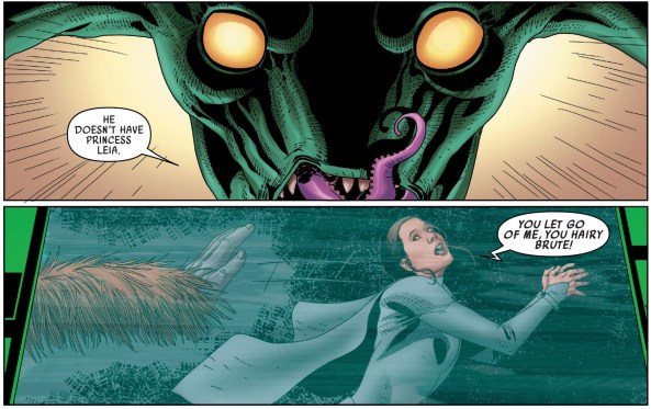 Even putting aside the Milk Problem and Larroca’s art — which I’m just as tired of talking about as he seems to be of drawing it — the issue is really let down by its lack of imagination. Star Wars as an entire multi-billion dollar enterprise is very self-referential, but there’s a dangerous line between honoring past Star Wars moments and recycling them wholesale. It’s disappointing that Star Wars 45 is unable to come up with a more inventive plan for the Rebels to gain entry into the secure facility than pretending that Chewie is a bounty hunter bringing in Leia. Like, I get that it’s a flip on the beginning of Return of the Jedi, but not in any interesting ways.