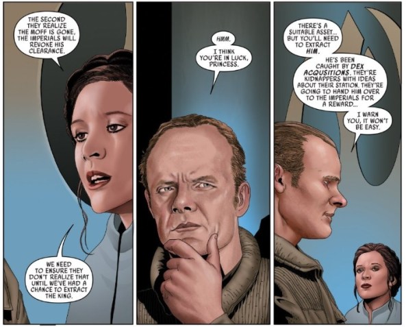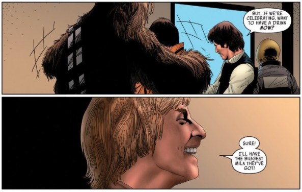 Elsewhere, the issue is similarly difficult to enjoy. While Leia is pitching her plan, Han and Luke go out for a drink and run into Wedge. Instead of having a bawdy ol’ time the likes of which would be fitting for Han Solo, the group sits down and sulks and discusses future war plans. Nothing about this is fun and it certainly doesn’t live up to the exciting bar scenes in virtually every other Star Wars story. As if acting as the avatar of this sad outing, Luke strangely opts out of drinking spirits, instead choosing to drink milk.