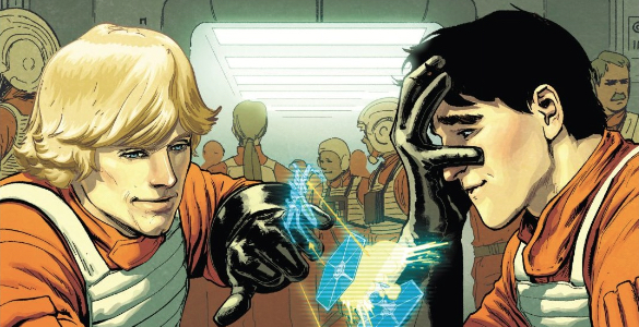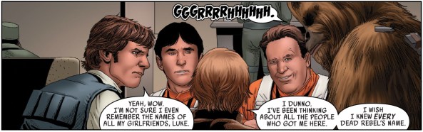 Mark: Taylor, I found this entire issue bafflingly bad, for all of the reasons you mentioned above. Just what is the deal with Luke’s characterization? He’s infantilized to a bizarre degree, with his dialogue reading like bits from an episode of Spin and Marty — all it’s missing is some Oh golly-s and a Jeepers, mister! to be truly tragic. When Luke’s approached in the bar by the surviving members of Red Squadron, his lament that he wishes he “knew every dead Rebel’s name” carries all of the gravitas of those terrible tweets people invent for attention about their painfully woke 4 year-old twin daughters looking up from their Froot Loops and, in unison, wishing for a sensible increase in the Federal gas tax because from the mouths of babes or whatever.