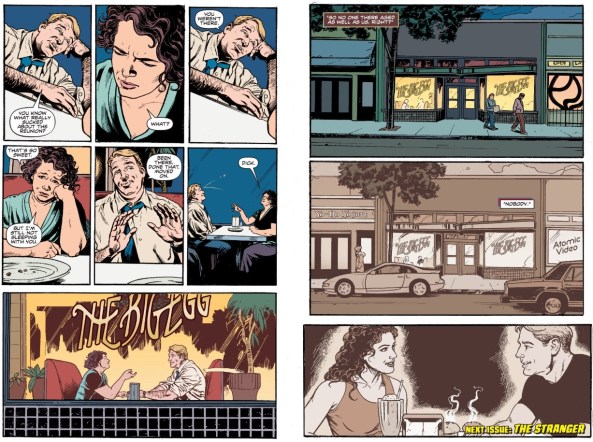 I’m always impressed by pages like these, where artists have to come up with a dozen one-off character designs; Sadowski does a fantastic job of coming up with disparate, expressive personalities and looks here. Likewise, I appreciate the diversity of experiences Andreyko conveys here, from those who are clearly just trying to cash in on a celebrity classmate to those who had stand-out experiences with Nick (rarely good) to those who perhaps took the whole experience a bit too seriously (I always thought the people who run alumni associations or arrange high school reunions might have a little too much time on their hands). Nick, on the other hand, only seems to have two really strong memories of high school: the football player who bullied him, and his first love.