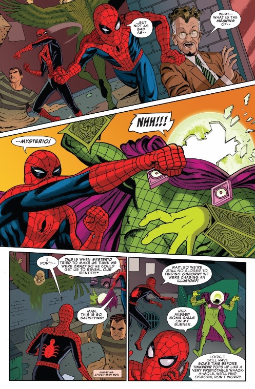 In a word, no. The idea of seeing two Spider-Men swinging together from the tops of buildings, beating up villains, and cracking jokes along the way sounds like a blast. And well it should be, but sadly that’s not the case in this issue. When Peter and Peter go out on patrol to catch Norman Osborne, they run into Mysterio and a droll battle ensues.