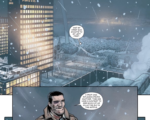 But then Jack’s confidence takes over. He lays out exactly how the rest of the scene is going to go, and it unfolds exactly like he says. It’s a fun bit of action, but wouldn’t mean a whole lot to us if we didn’t already know that he has a rifleman posted up somewhere else, and that he and that shooter would be racing to kill the guy in the middle. It’s vital context that fills what might otherwise feel like a perfunctory page or two of action with meaningful character beats.