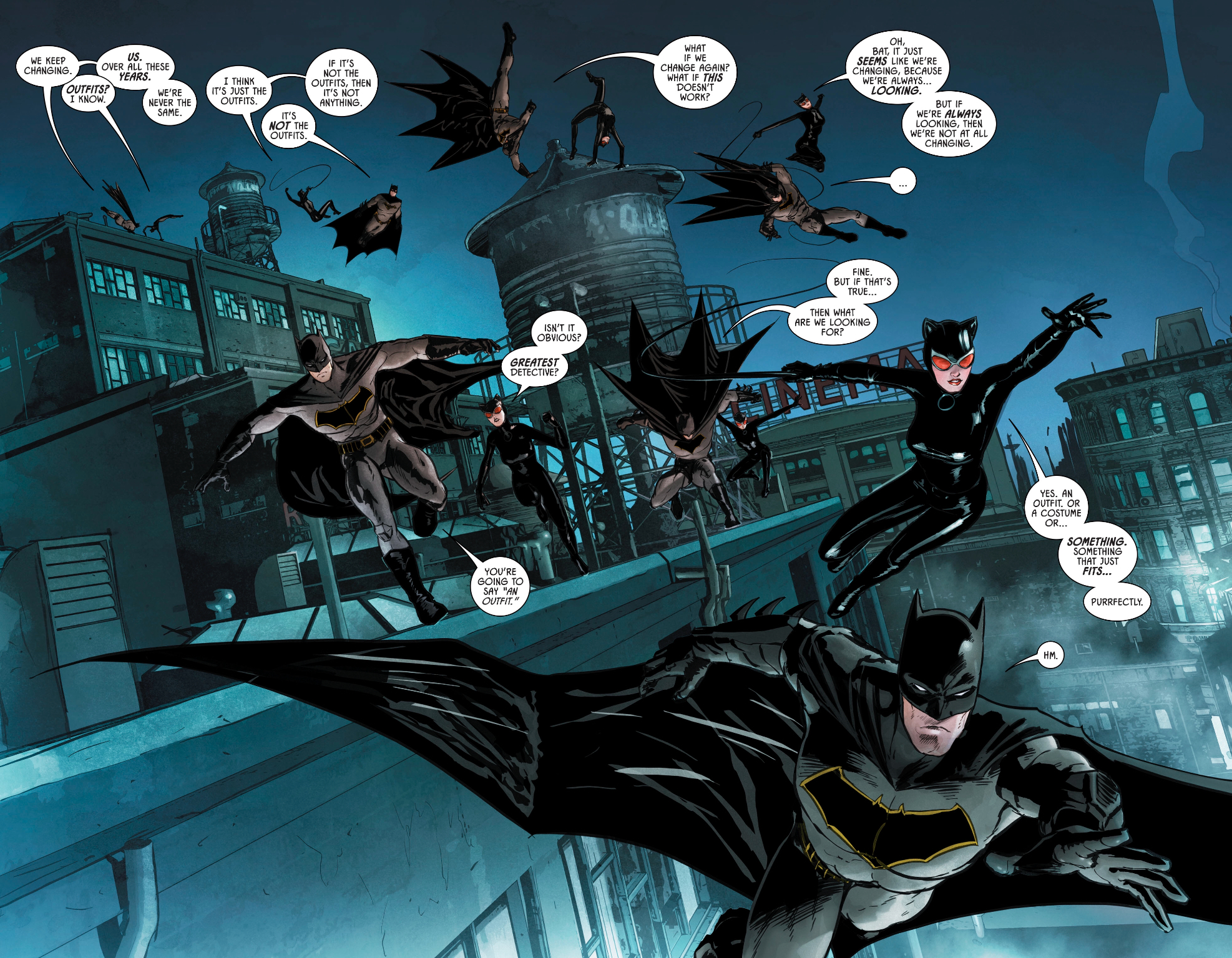 I have to admit that when reading the issue, I could tell it was referencing the past thanks to the throwback costumes, but couldn’t place the specific moments being recalled outside of the final one from Hush. A lack of Batman scholarship isn’t a barrier for entry (a quick Google search will bring up plenty of articles explaining the references), but King’s deep dive into Batman history seems like it would be particularly rewarding for those with a fondness for that sort of thing.