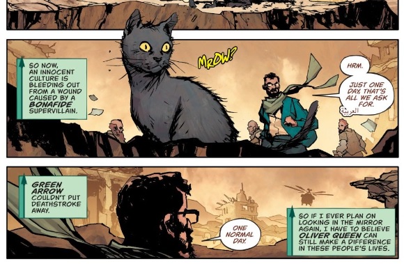The issue never makes it totally clear why Ollie feels so personally responsible for Deathstroke’s actions (unless he was involved in the Deathstroke annual referenced by the editor, which I haven’t read), but it makes a handy fill-in for the kind of guilt so many white liberals feel. This guilt often leads to aimless donations or trips to third-world countries that do little to address the underlying problems facing its citizens; I believe that most of these activists mean well, and that every little bit of help is important, but also that many of these activists aren’t doing as much as they could because they’re out to assuage their own guilt more than they are to truly fix things. Sometimes they can even make things worse, which is exactly what Oliver does when he drops into an active war-zone without truly understanding the conflict it faces.