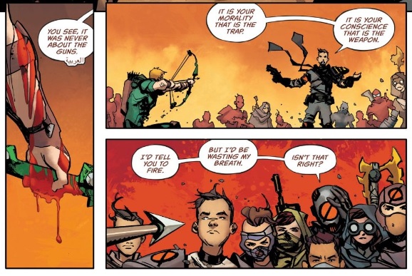 Nothing and his band of child soldiers make compelling villains. They’re not something either Ollie or Green Arrow can just swoop in and fix, which challenges his privilege, but they also challenge the very best parts of his morality as well.