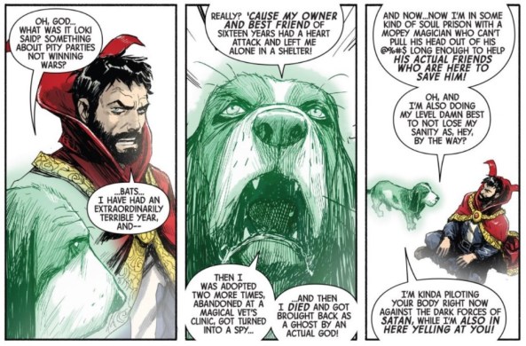 Bats isn’t just being rude here, he’s reached his breaking point. As he says, he’s had a pretty shitty year and he’s been dealing with way more weird stuff than any dog should. This highlights something that’s easy for me to forget when reading Doctor Strange — all of the stuff that happens here is not normal. It gets normalized because I see it every it month, but it’s definitely weirder than most heroes, let alone average dogs, encounter in a lifetime. That being said, I admire Bats for being able to roll with all of this crazy crap. Put in his situation, how many of us would actually be able to cope with it all?