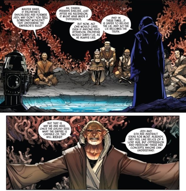 This is the page in this issue that can’t help but to bring to mind current politics. Palapatine is a pretty clear stand-in for Trump, the demagogue whose every lie will be believed as gospel, for whom the truth seems to slide off like Teflon. Barr knows that the only two sides that mean anything anymore are oppression and freedom, and in an age where the power and backing of both major political parties seem weaker and more corrupt by the day, this certainly feels true. The only things people can rally behind anymore is either trying to free others or trying to hurt them, and both sides often mean taking drastic measures.