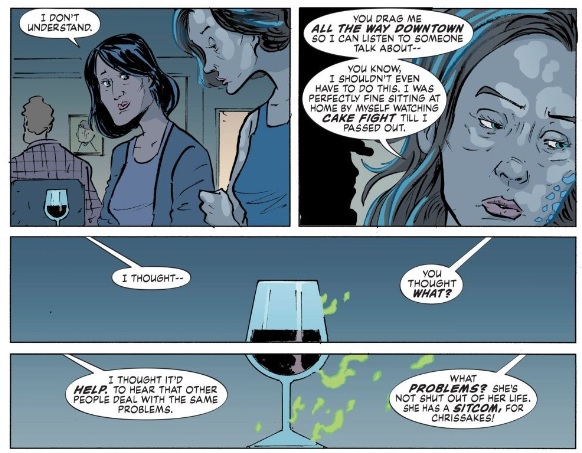 Again, it’s no wonder that Caroline thus embraces an opportunity to bring about the end of all creation just to feel in control of something again. On a smaller scale, this plays out when Caroline destroys Sloan’s home (and quite likely kills him and his family). She’s acting out on destructive fantasies she’s been nurturing the entire issue, doing something destructive just to gain some modicum of calm and control. It paints Caroline as a villain, but one whose desires are understandable and sympathetic nonetheless — I want her to find a better way to take control of her life than the offer Madame Atom offers her, not just to save the universe, but so that she can find some peace that doesn’t involve her own death as well.