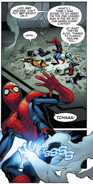 This issue’s other focus is Peter’s allies, which allows Slott to tie up a few more loose ends (such as Clash’s status and perhaps Anti-Venom’s powers altogether), but also to give some attention to characters who are important to Peter but who Slott hasn’t always had the time to highlight perhaps as much as he’d have liked (Silk, Miles Morales). Ultimately, though, their failure gives Peter an excuse to put back on the Spider-Man suit — no matter what threats Osborn may have made — and swing back into action. In some ways this is an underwhelming choice, if only because it means that the intriguing scenario established last issue (that Peter has to fight Osborn as Peter, not as Spider-Man) only lasts half an issue. Even Peter himself doesn’t seem to think it was all that interesting or effective for him to suit back up and try to help.