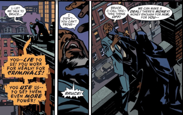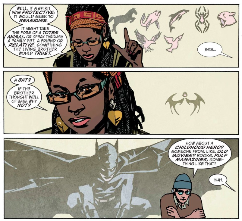 Bruce discovers that he has a twin brother Thomas, who was stillborn. With this knowledge he concludes that his Batman creature is in fact Thomas. To gain a better understanding on what might drive Thomas, Bruce consults with a professor of parapsychology and occult studies. He compares his Batman to similar spirits and totems through folklore. Bruce believes he is doing research but really he’s just confirming his own bias.