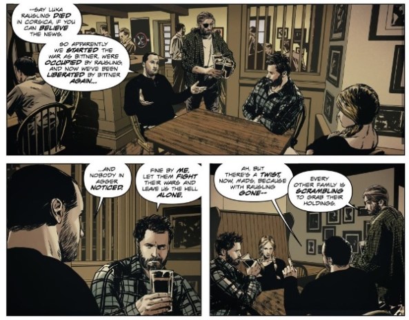 One of the huge successes of this issue falls on the depiction of this Danish town, as you said, Spencer. I find it very appropriate to set this interlude here considering the involvement of the Scandinavian nations in a world conflict like WWII. During the first eight months of the war, it was known informally as “the Phoney War” seeing as not much seemed to be happening aside from political posturing and troop movements; however, the Scandinavian countries — despite their decidedly neutral stances — found themselves quickly involved, though they might not have been part of the “official” theatres of war. Norway, for example, held a key position along the sea which made them a point of high contention for both the British and Nazi maritime forces and were occupied by the Nazis in 1940 — something I never learned about in high school history. Or maybe you read the classic Lois Lowry novel Number the Stars back in the day, but the Danish resistance tried to help Jews of their country to safe harbor in Sweden, a country which itself was coveted for its iron ore mines as crucial to the Nazi war machine. Knowing how deeply involved the Scandinavia countries were in WWII, I found it so fitting to read that these territories, even in this dystopian future, still find themselves points of interest, having been originally property of Bittner, then taken by Rausling, only to return to Bittner with the threat of the Russian House Vassalovka looming.