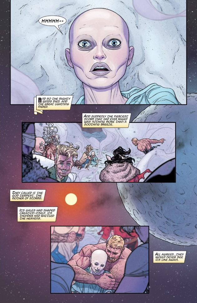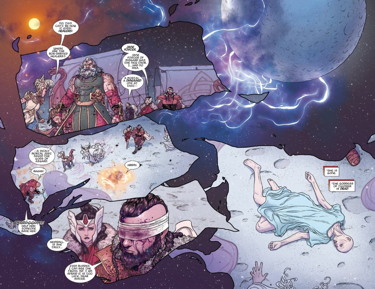 And I think the reason Jane’s survival works so well is because of Odin. GE Scott would be right, were it not for the fact that this is Odin’s story. It would have been cheap if Odinson just lightining struck her until she came back. But the fact that the Mother Storm was so powerful that he couldn’t is important. It is only with Odin that he could.