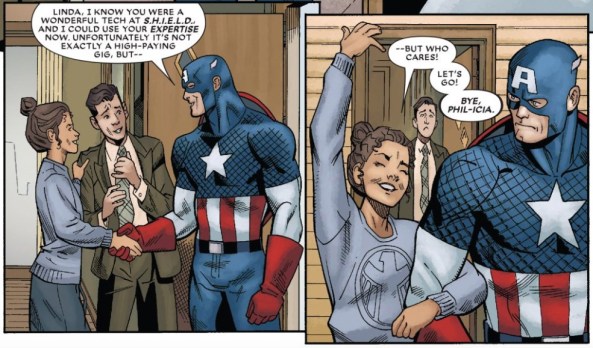 Writer Gerry Duggan and artist Mike Hawthorne demonstrate this “tell, do, tell again” philosophy in the first two pages. Linda, a decommissioned S.H.I.E.L.D. technician mopes around the house while her husband berates her for not looking for a job. Then Captain America knocks and the door and offers her a job.
