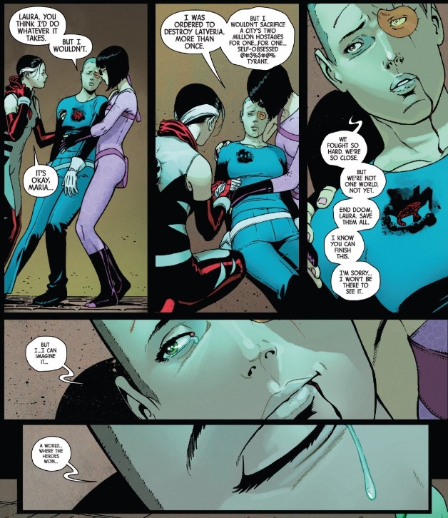 Laura’s vision of a perfect world, where the heroes win, is enough to melt even Maria Hill’s cold heart and give her hope for a better world. It’s a powerful testament to the work Laura’s done, but again, I wish we got to actually see more of what Laura’s done to inspire so many. Likewise, Hill is a bit of a strange choice to focus so much of this arc on — I believe she and Laura have interacted and perhaps even clashed before, but this issue implies a much more significant relationship and story between them than they ever really had. As much as I’d hate to lose this moment, or even the cameos, they ultimately feel like a distraction from the real meat of this story.