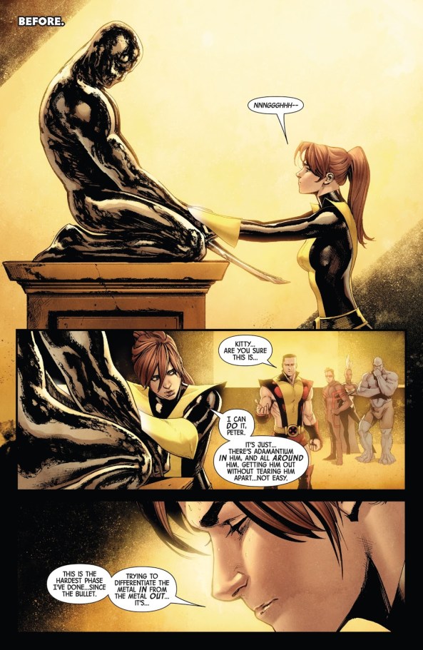 Nevertheless, I was happy that Soule and David Marquez placed Kitty at the center of the “Logan excavation.” Likewise, I liked the emphasis placed on how hard it was for Kitty to pull Logan’s body out, making a reference to her most difficult phase from Joss Whedon’s Astonishing X-Men.