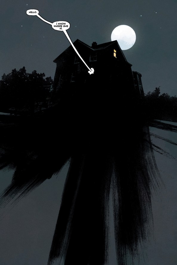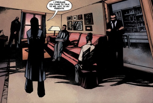 “Silent” isn’t exactly the right word for it. Freeman makes his threat increasingly clear, though always with just a light enough touch to maintain plausible deniability. His presence at her family home is an obvious one, which he explains away as being in town for a conference. His entourage of goons is another, which he claims to only recognize as intimidating in hindsight, though he articulates it so perfectly, it’s hard to imagine it as anything other than intentional. Kot and Žeželj cleverly smash these explanations together in this menacing soliloquy, accompanied by an ambiguously sincere/threatening sliced up image of Freeman’s face: