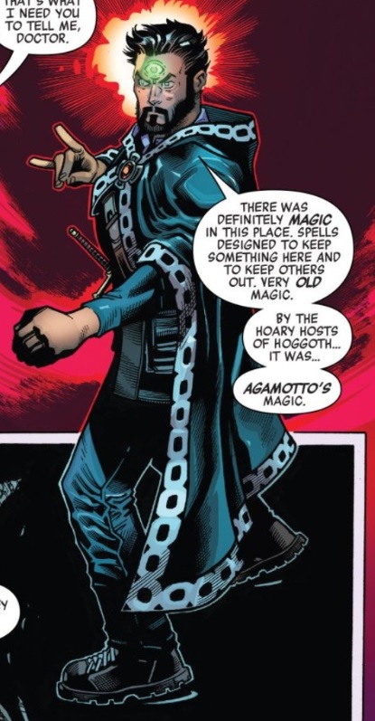 The way these humans are drawn in this issue also stood out to me. Ed McGuinness’s style is a mix between traditional comic book art and a more modern hybrid involving manga. His characters have large, expressive eyes and it follows that the rest of their bodies are also drawn with slightly exaggerated features. For some, this might be fine, but the chunky style is problematic for me. Look at this full body shot of Doctor Strange: