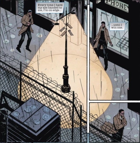 We start the issue as Frank and his pops are under siege from the US government. Our heroes are outnumbered, so Frank takes a beating. A literal beating — even takes a blackjack to the face. Then he’s made to accept the Terms and Conditions of Aunt Sam, the head of whatever governing body is about to complete screw up his business. He is attacked, both physically and ideologically, and straight-up loses. So, what’s a guy to do?