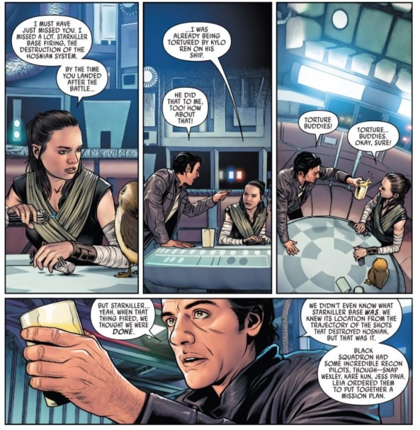 The answer is not really. The best moments of this issue are when we’re privy to the quiet moments these characters get to spend with each other. My favorite of these moments comes when Rey recounts how she was tortured by Kylo Ren, to which Poe enthusiastically tells how the same thing happened to him and pronounces them “torture buddies.”
